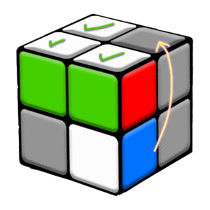 Perform the Corner Orientation Sequence: Take the front-right corner piece out with R (turns the the right side up), U (turns the top layer to the left), R’ (turns the right side down) –> Rotate the top layer to the left with a U move –> Insert the corner piece back in with R (turns the right side up), U2 (turns the top layer twice), R’ (turns the right side back down again).